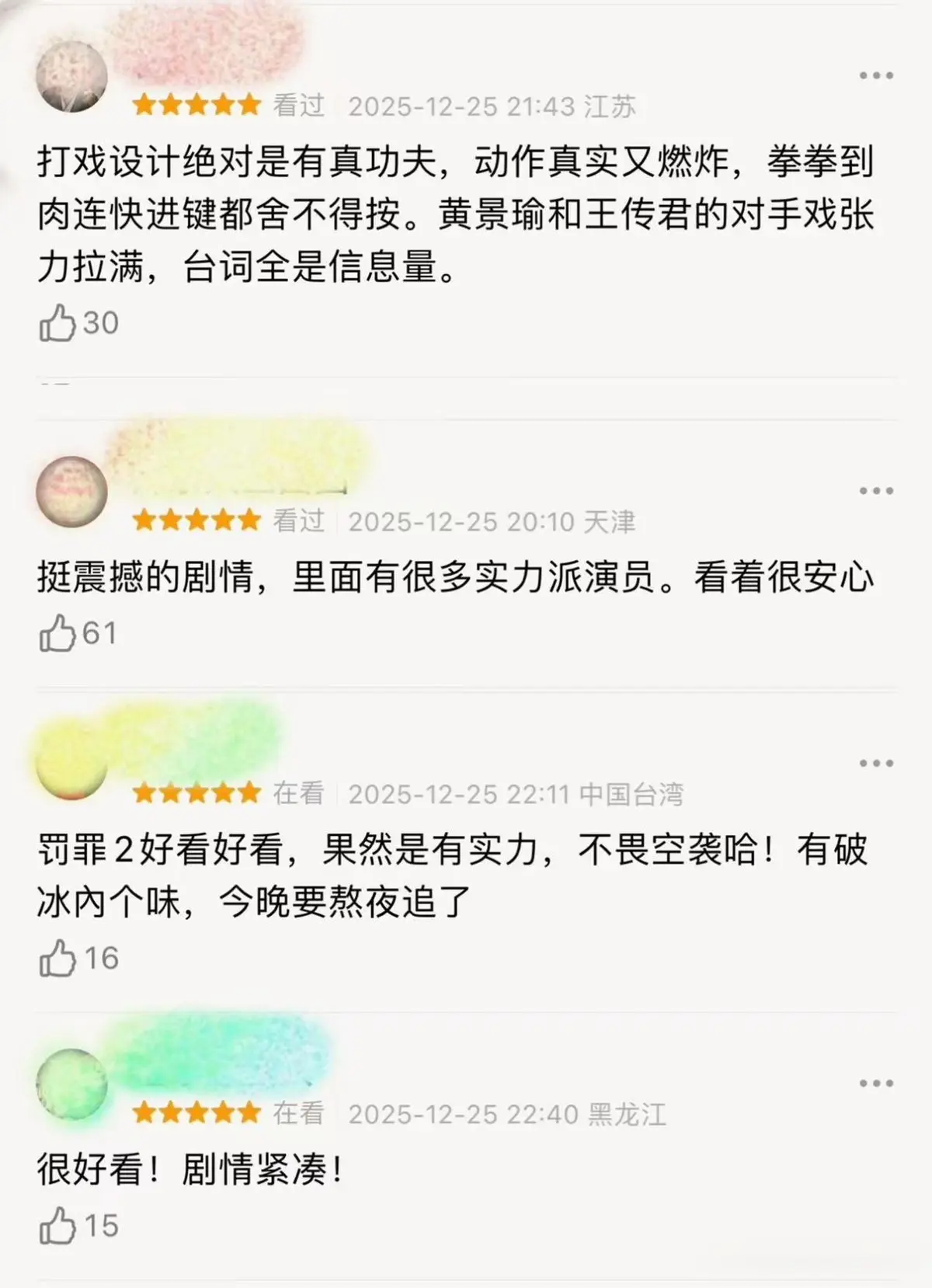 “预约破百万不是没有道理,剧情不拖沓全是高能输出,每个案件都紧贴现实,节奏紧凑”“硬核罪案的质感扑面而来,年度必看名单预留一位”“打戏设计绝对是真功夫,动作真实又燃炸,拳拳到肉连快进键都舍不得按,黄景瑜、王传君的对手戏拉满,台词全是信息量”……