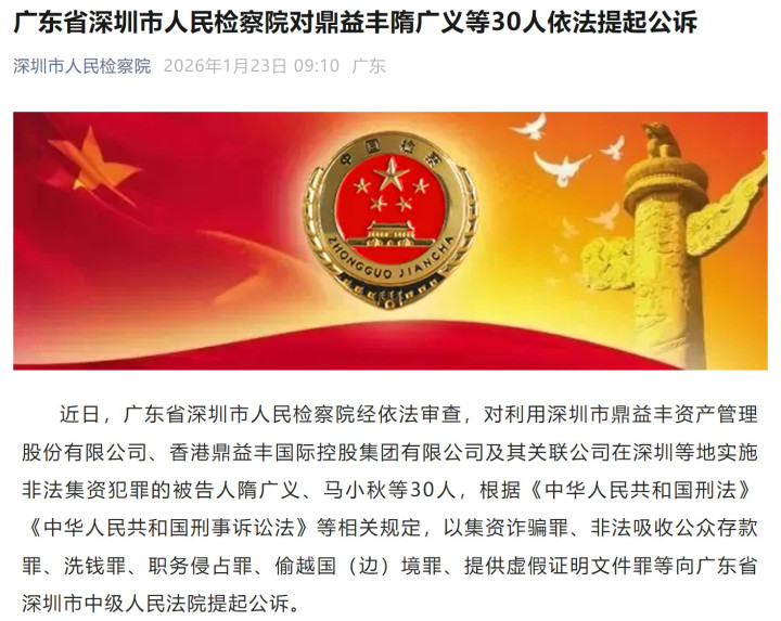 1月23日,深圳市人民检察院发布公告称,该院近日对利用深圳市鼎益丰资产管理股份有限公司、香港鼎益丰国际控股集团有限公司及其关联公司(以下合称鼎益丰)在深圳等地实施非法集资犯罪的被告人隋广义、马小秋等30人,依法以集资诈骗罪、非法吸收公众存款罪、洗钱罪、职务侵占罪、偷越国(边)境罪、提供虚假证明文件罪等向广东省深圳市中级人民法院提起公诉。